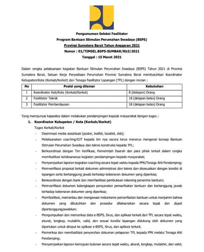 Loker Bsps 2021 / Lowongan Tenaga Fasilitator Kementerian Pekerjaan Umum Dan Perumahan Rakyat Tahun 2021 Cengos Indonesia - Scan surat lamaran (menyebut dengan jelas posisi yang dilamar, nomor handphone dan whatsapp yang dapat dihubungi dan harus ditandatangani diatas materai rp.